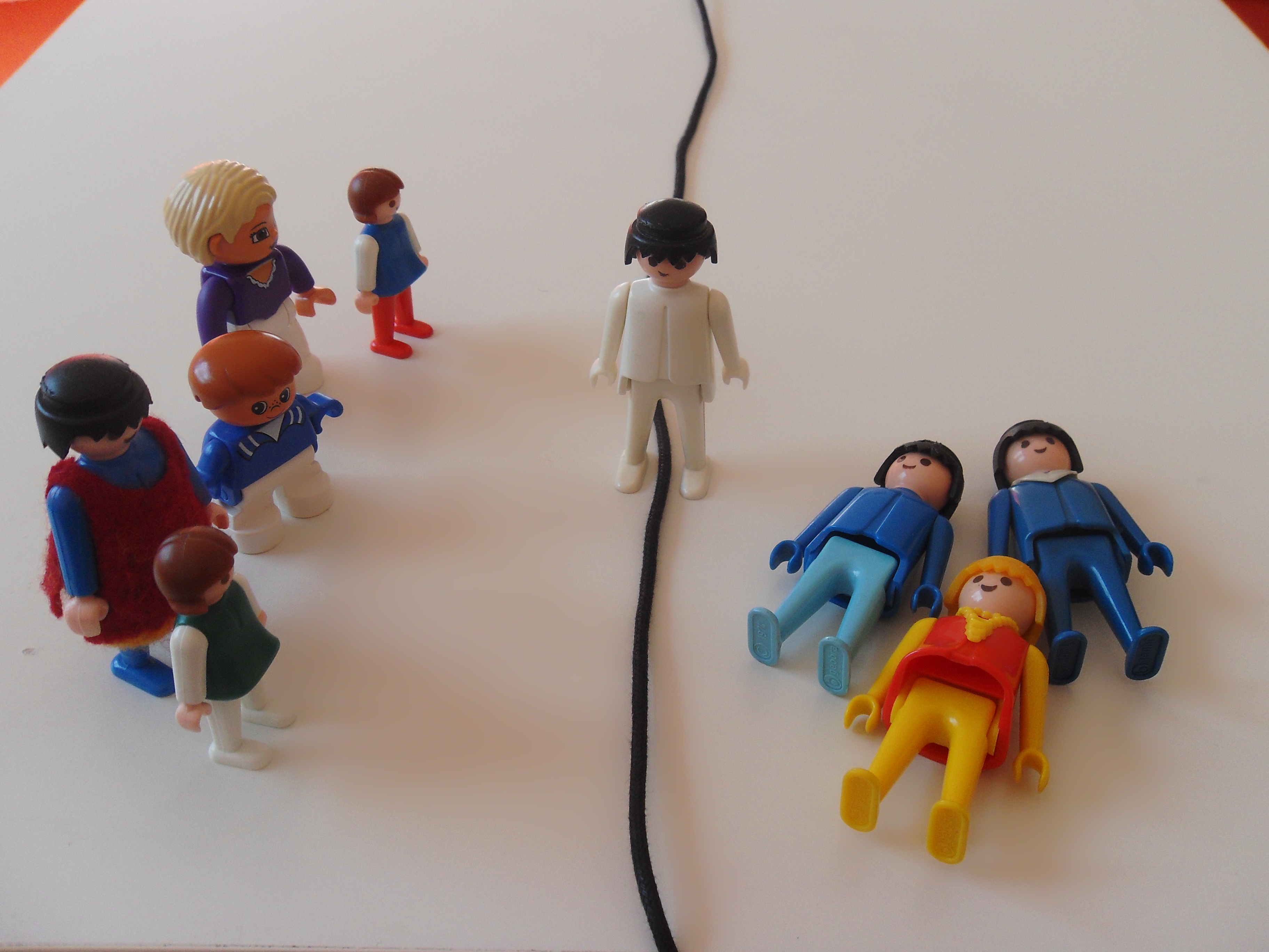Wim kijkt naar het verhaal op tafel: vrouwen en kinderen aan de ene kant van het touw, en vader, moeder en broer aan de andere kant. En Wim in het midden, een voet in het leven en een voet in de dood. “Ja”, zegt hij, “dat is precies hoe ik me voel. Ik balanceer op de grens, weet niet meer waar en bij wie ik het liefste wil zijn. Bij mijn familie, mijn broer vooral die ik zo verschrikkelijk mis. Of bij mijn vrouw en kinderen, die mij nodig hebben, die niet nog een dode erbij kunnen hebben.”